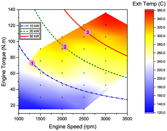 B. Engine Emissions Constraint: The engine HC, CO, and emissions are considered in selecting the engine operating points. CO and HC conversions in diesel oxidation catalysts (DOC) are a function of the exhaust gas temperature. Thus, the engine operating points are selected to meet the minimum DOC light-off temperature. The RCCI engine exhaust gas temperature for different engine speeds and torques are shown in Figure 6 based on the data from [40] along with the selected operating points. It is shown in Figure 6 that the exhaust gas temperature for all of the three engine operating points are above 290 °C. Moreover, in reference [50], it is shown that the DOC for the same RCCI engine achieved 90% and 100% HC and CO conversions, respectively, when the exhaust gas temperature in the RCCI engine was higher than 290 °C. Thus, the selected RCCI engine operating points meet the DOC light-off temperature to achieve low HC and CO emissions, similar to those in the CI and SI engines.
