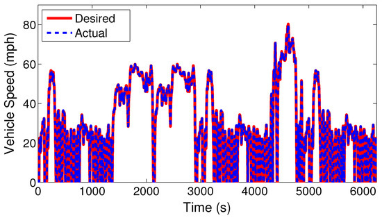 Figure 11 shows the vehicle tracking performance. The vehicle is able to follow the reference driving cycle with a root mean square error (RMSE) of 0.8 mph. This result also confirms that the HEV components’ sizing meets the performance requirements during the driving cycle. Thus, the HEV model can be used as a testbed for evaluation of EMCs.