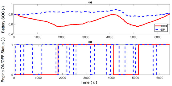 Figure 12 compares the engine on/off status and the battery SOC variation for both RBC and DP EMCs. The RBC strategy regulates the engine status command based on the SOC value. The RBC switches the engine on when the SOC reaches to its lowest allowed value (i.e., ). In the DP controller, the SOC variation is much less than that of the RBC. This allows the EMC to choose the most optimal control strategy over the driving cycle at each time. However, in the DP strategy, the engine switches on and off more frequently (Figure 12b).