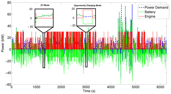 Figure 13 indicates the power distribution of the battery and the engine during the driving cycle for the DP control strategy. There are different operating modes, such as fully electric mode and opportunity charging mode based on Figure 13. For instance, the battery only supplies the driver power demand at s and runs the vehicle on the fully electric mode. For low power demands, at s, the vehicle runs in the opportunity charging mode, in which the engine/generator supplies the power demand and charges the battery simultaneously. In RBC, the engine is turned off during the braking, but in the DP strategy, the engine can either be on or off to minimize the cost function. In addition, at the low vehicle speeds, the mechanical braking assists the regenerating braking to supply the braking torque, however, at the high vehicle speeds, all the braking torque is supplied by the regenerative braking.