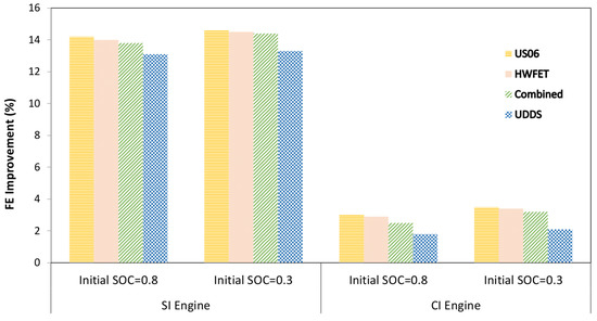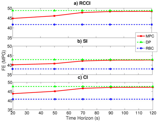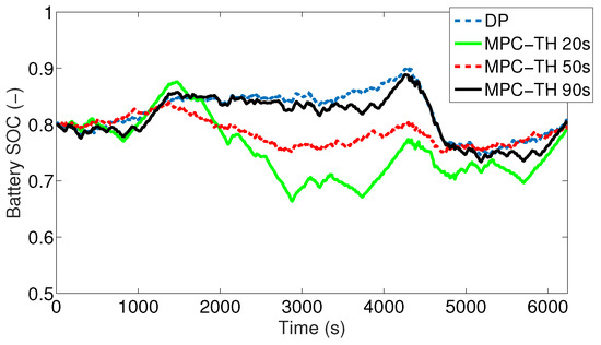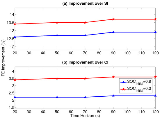 In this section, the results for the SHEV with the RCCI, CI, and SI engines are discussed. In Section 5.1, sensitivity of the driving cycle’s prediction time horizon on the vehicle’s fuel economy is studied. Moreover, the initial battery SOC effect on the vehicle’s fuel economy is investigated in Section 5.2. Lastly, the effect of the type of the driving cycle is presented in Section 5.3.