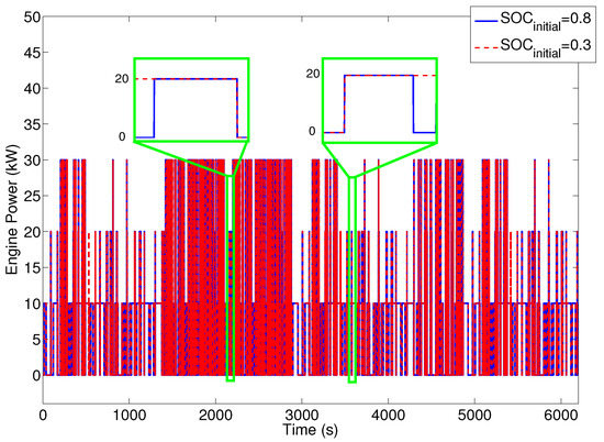 In on–off RBC, the EMC rules are designed heuristically without driving cycle information. The battery SOC is the only input to the control unit, which forces the battery to keep the SOC in the desired window (i.e., ), by controlling the engine on/off status. The on–off RBCs cannot adapt their rules with changing driving cycles. This results in non-optimal efficiency for a wide operating range. Simple implementation for real-time EMC applications is the major advantage of on–off RBC strategies [48]. Here, a heuristic RBC is designed to keep the battery SOC within the desired window.
