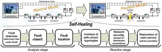 Thus, as can be seen in Figure 1, when a fault happens in a self-healing power network, it is easy to distinguish two main stages.