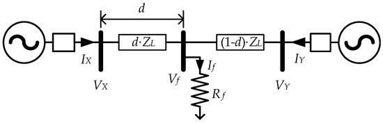 Based on the simple fault analysis, “l-l” fault between x and y phases (see example in Figure 3b) is resolved through Equation (8), and constants and (Equations (9) and (10) respectively).
