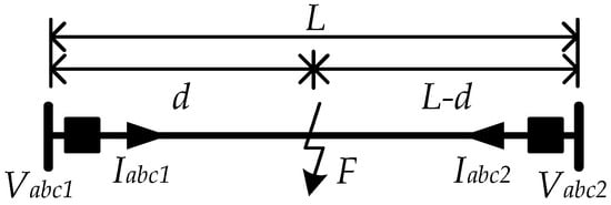 Additionally, is the measured voltage at M node and three-phase line x (line under fault). is the fault current. Constants and are defined by Equations (6) and (7) respectively, where is the input current of the section M-N (in phase x) and is the impedance vector of affected section, between x and k phases.