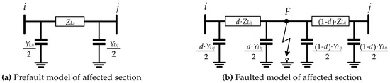Later, this method analyzes how the system is modified under fault conditions (changing the affected model segment from Figure 7a to Figure 7b). In this sense, based on this change, a new model can be implemented adding the node F to this expression, associated with the fault (see Equation (26)).