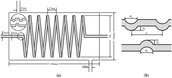 Figure 1 presents dimensions of the shell and helically-coiled dimpled-tube heat exchanger system. The overall system has a length of 230 mm and diameter of 120 mm. The coolant enters through the inlet of 12 mm diameter, and exits through the same diameter outlet. The outer and inner diameters of the helical tube are 12 and 9 mm, respectively. The helical tube has 10 turns with the coil pitch of 17 mm and a curvature radius of 2Rc, as shown in Figure 1a. The height (Hd) and diameter (Dd) of the dimple are 1.336 and 6.903 mm, respectively; the pitch of the dimple (p) is 5.628 mm, as shown in Figure 1b. Figure 2 shows the schematic of the dimple arrangement. The dimples on the helical tube are arranged in the following three arrangements: staggered, inline, and bulged. Further, this tube’s heat transfer performance was compared with that of the flat helical tube. The heat transfer enhancement structure consists of two dimples: concave and convex dimples. However, the bulged arrangement consists of convex dimples.