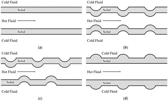 Schematic of the dimple arrangement: (a) flat; (b) inline; (c) staggered; and (d) bulged.