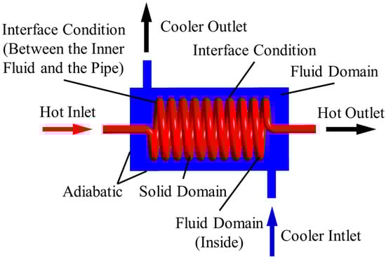 where Rei is the Reynolds number at the inside of the coiled tube, d is the diameter of the coiled tube, and Rc is the curvature radius. A relative pressure of 0 Pa was applied at both the shell- and tube-side outlets. At the contact surface between the solid and fluid domains, an interface condition was applied to estimate the conjugate heat transfer by using a general grid interface connection [18], which has been applied to many numerical analyses of different physical domains, such as rotating and stationary domains [23], or fluid and solid domains [24]. All of the wall surfaces on the outside of the heat exchanger and calculation domain were assumed to be nonslip and adiabatic.
