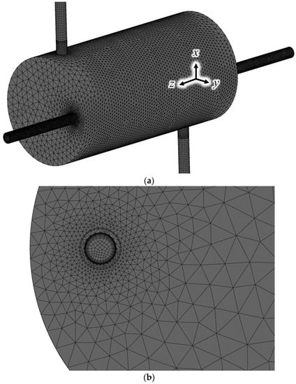 The present numerical analysis was performed using commercial computational fluid dynamics code ANSYS CFX 17.0 (© 2016 ANSYS, Inc., Canonsburg, PA, USA) [18] to solve the governing equations for 3-D steady turbulent flow and conjugate heat transfer in the heat exchanger system. For a steady, incompressible, turbulent flow, the continuity and Reynolds-averaged Navier-Stokes equations are given as: