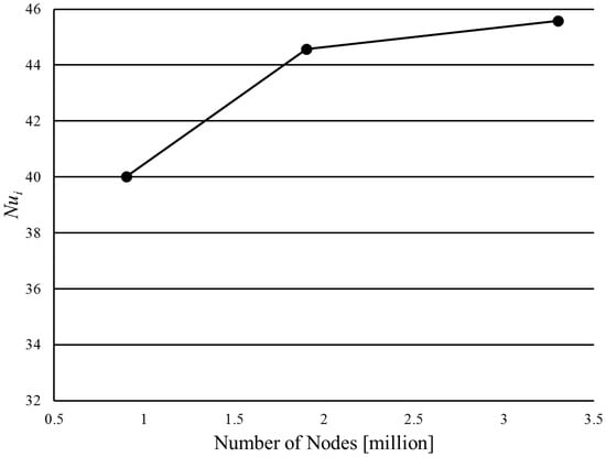 To determine the optimal number of the grid elements, three nodes of the grid system in the range of 900,000 to 3,300,000 were tested; Figure 5 illustrates the test result for a flat helical tube at De = 111. The Nusselt number on the inner surface of the coiled tube (Nui) was used as a criterion for the comparison and is defined as Nui = hidi/k, where hi and k are the area-averaged convective heat transfer coefficient at the surface of the inner fluid domain and the thermal conductivity of the inner fluid, as shown in Equation (3), respectively. The deviation of the coarsest grid system (0.9 million) shows a relative error of 12.22% compared with the finest grid system (3.3 million), while the deviation of the second finest grid system (1.9 million) shows a relative error of 2.19%. Resultantly, approximately 1.9 million nodes was decided to be the optimum number of nodes for calculation; however, the number of nodes varied with the shape of the coiled tube from 1.9 to 2.1 million.