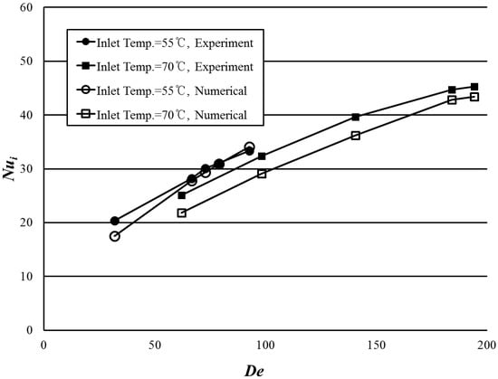 To assess the validity of the numerical solutions, the results were compared with the experimental data of the flat coiled tube, as shown in Figure 6. The validation was performed for Nui with various De and two temperatures at the inlet of the tube-side. The results of Ti = 55 °C showed a deviation of 14.0% relative error at De = 31.8, and 1.7% averaged relative error at De > 66.7. The results of Ti = 70 °C showed 5.7% averaged relative error at De > 140, and 11.5% averaged relative error at De < 98.3. Overall, the present numerical results show good agreement with the experimental data.