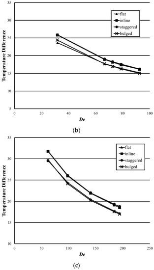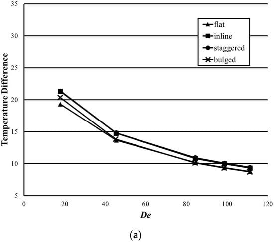 Figure 7 presents the temperature difference charts of the hot channel with various De. The difference was calculated as ΔT = Thot,in − Thot,out. The deviation in each case shows an almost similar trend. The inline and staggered arrangements show the highest temperature differences through all De values, whereas the staggered arrangement shows a slightly higher temperature difference. In addition, the bulged arrangement shows a higher temperature difference at lower De (<40) with Thot,in = 45 and 55 °C; however, as De increases, results similar with those of the flat case are observed. At Thot,in = 70 °C with a higher De (>100), the flat case shows a slightly higher temperature difference. It was obvious that increase in the residence time of the hot channel fluid increased the temperature difference of the hot channel.