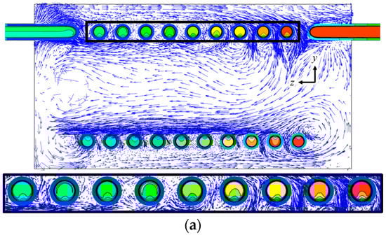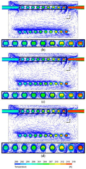 Figure 8 shows temperature contours inside the helically-coiled tube with the velocity vector of the cold channel on the y–z plane at x = 0; De = 17.87 and inlet temperature of the hot channel is 45 °C. The results were focused on the temperature variation inside the coiled tube with a circumferential fluid flow on the shell-side. The hot fluid was affected by the centric fluid flow rather than outer fluid flow on the shell-side; therefore, the thermal layer inside the tube started at the inner surface for all cases. The high temperature fluid flows along the shape of the helically-coiled tube and the fluid that is closer to the center of the shell flows more slowly than the fluid that is farther from the center of the shell due to the centrifugal effect. Moreover, the fluid inside the shell-side flows faster at the inner area than at the outer (near wall) area. As the inline and staggered arrangements show rapid temperature variation in the coiled tube, the thermal layer was observed simultaneously from the inner and outer surfaces, and a lower temperature of the hot channel was observed near the exit, as shown in Figure 7.