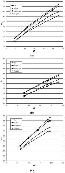 Figure 9 presents the Nusselt number inside the helically-coiled tube with various De values and inlet temperatures of the hot channel. The staggered arrangement shows the best heat transfer performance, while the inline arrangement shows the second best performance for all ranges of De and inlet temperature. The bulged arrangement shows a higher than the flat arrangement at a lower De (<30); however, the flat arrangement shows a higher Nui value at a higher De (>40) at Thot,in = 45 °C. A similar result can be observed for Thot,in = 55 °C. The deviation between each case was increased with a higher De value at all inlet temperatures.