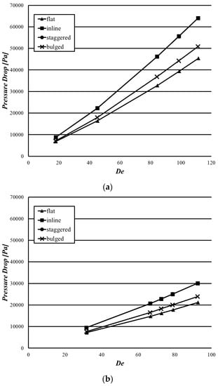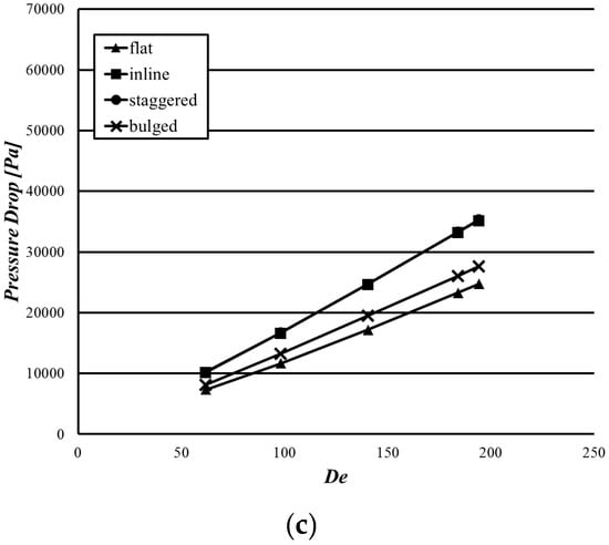 Figure 10 shows pressure drops at the helically-coiled tube with various De. The inline and staggered arrangements with the best heat transfer performance show the highest pressure drop for all inlet temperatures of the hot channel, and the flat arrangement shows the lowest pressure drop for all inlet temperatures. The deviations between each case increased with the De for all inlet temperatures.