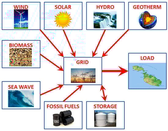 The electrical power production is almost completely based on diesel generators in many islands in the Mediterranean Sea []. The fuel is usually shipped by mainland and long underwater cables sometimes connect the small islands to the mainland []. Due to these reasons, in small islands, the electrical power production shows higher operating costs and losses than in mainland []. The use of Renewable Energy Sources (RES), such as solar, wind, biomass and sea wave, will produce a reduction in energy dependence on fossil fuels and the improvement of the efficiency of the electrical grid []. The RES also contribute to the reduction of greenhouse gas (GHG) emissions and environmental pollution. After the ratification of the Kyoto Protocol, the European Community undertook measures to cut its GHG emissions by 8% of 1990 levels []. According to the European Directive 2009/28/EC (Annex I), Malta is required to produce 10% of its energy from RES in gross final consumption by 2020 [,]. Malta’s target is considerable, although it is lower than other European Countries, because Malta presents quite particular conditions, such as other Mediterranean islands: high population density, limited available land and an ever increasing electricity demand. In order to achieve the environmental and energetic targets [], Malta will have to use all available renewable sources []. Moreover, Malta’s electrical grid needs several developments in order to minimize the electrical problems caused by varying power outputs of RES, such as wind, solar and sea wave []. The following Figure 1 shows the properties of the future grid. Every available RES will be used to produce electrical energy []. In order to match the electrical load and the electrical production by RES, new innovative storage systems have to be developed.