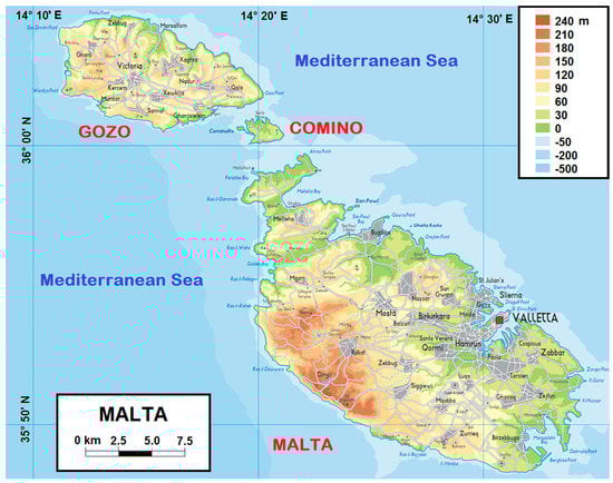 Malta’s Country is an archipelago, located in the middle of the Mediterranean Sea. It is situated at 80 km south of Sicily, 284 km east of Tunisia and 333 km north of Libya. The capital city is Valletta, with the geographical coordinates 35°53’ N–14°35’ E. It is situated in the largest island (called also Malta) of the archipelago, as shown in Figure 2.
