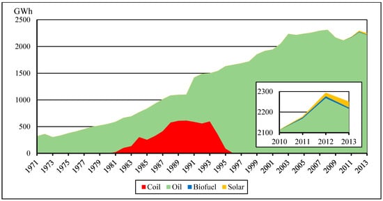 In Figure 4, electrical energy generation by fuel in Malta is shown, during the period 1971–2013. This trend is characterized by an important increase, from about 300 GWh/year in 1971 to 2254 GWh/year in 2013, during which 2216 GWh/year was produced from oil plants, 6 GWh/year from biofuels and 32 GWh/year from photovoltaic plants []. Therefore, renewable energy production has a marginal role in comparison to the other European countries.