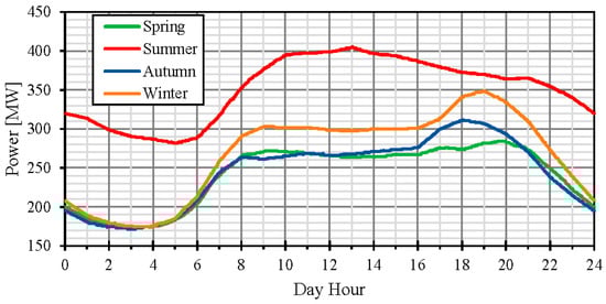 Figure 5 shows the typical electrical load profile in Malta’s archipelago during the four seasons (2012) []. The graph shows a significant increase of electrical demand during summer, due to tourists’ arrivals: the minimum power request in summer is close to the maximum request during spring or autumn. The peak of request is placed between 4 p.m. and 8 p.m. for most of the year. In summer, the peak of request is shifted to 1 p.m.