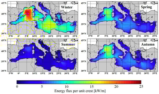 As shown in Figure 7, the energy potential is higher in winter than in summer. Intermediate conditions are in spring and autumn []. In the figure, we can identify the hot spots, i.e., the sea regions characterized by high energy potential [].