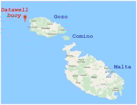 The in situ measurements along Maltese coasts was realized with a single Datawell Waverider buoy, which was installed about 2 km west of the Gozo coastline, in a depth of 200 m []. Figure 8 shows the location of the measuring buoy along Maltese coasts. The use of wave buoys has a fundamental role in order to have some first data about wave potential with an experimental measurement campaign. However, they are usually too expensive, so they are used only in a first part of an assessment, especially in order to validate software data. The Gozo wave buoy was able to define the wave climate in Gozo and in the north-west part of the Maltese Archipelago, while it was also useful to know the wave energy potential along all the coasts. Additionally, maintenance costs usually reduce the measurement period to some years. In the case of Gozo’s wave buoy, measurements were performed from 14 September 2011 to 13 September 2012 [], in order to know the seasonal variation of the wave climate.