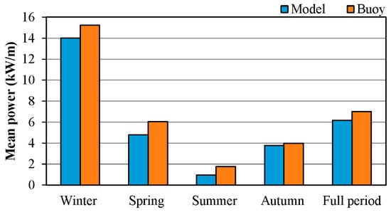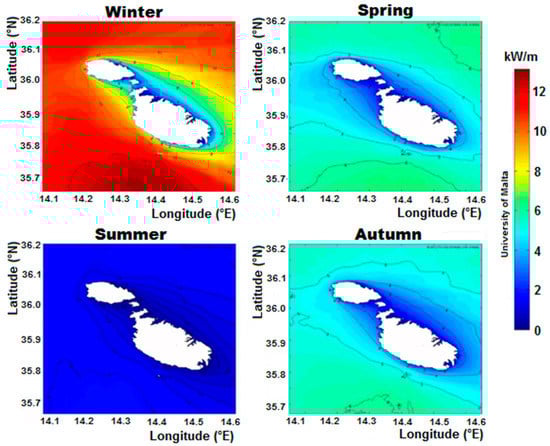 This model is particularly advantageous with propagation problems from deep waters up to the coasts. Both buoy data and SWAN data have highlighted an important seasonal variability of sea wave power along Maltese coasts. Wave power is characterized by high values during the winter season, which decrease in autumn and spring while the minimum values are recorded in summer. Moreover, winter wave power is more than double the annual average, as shown in Figure 9, obtained from the data reported in [].