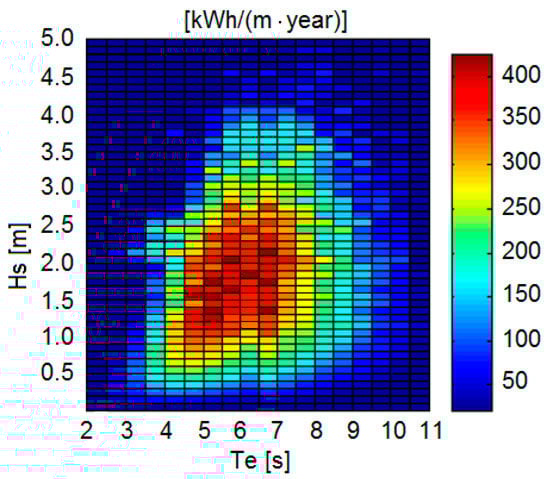 The main parameters that define wave energy resources are Significant Wave High and Energy Period . The first one is measured in meters, the second one in seconds. For each sea state, using 1025 kg/m3 for the density and 9.807 m/s2 for the gravitational acceleration [], the corresponding wave power is calculated through this expression: