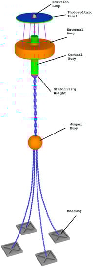 On the lower part of the internal buoy is located a hemispherical weight (pink in the picture) in order to confer greater stability to the system, guaranteeing its correct vertical positioning. This hemispherical weight is connected to a jumper buoy (yellow sphere) through a big chain, while the same jumper is connected to four moorings, placed on the seabed. In this way, the four chains, connecting the moorings and jumper, are constantly maintained in a vertical position, avoiding the scraping of the seabed. An intermittent red position lamp is positioned on top of the buoy, making visible the WEC up to several nautical miles away []. As shown in Figure 12, a photovoltaic panel can be installed in the upper part of the WEC.