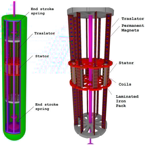 Each linear generator is composed by a translator and a stator. The first part is composed by 132 neodymium-iron-boron permanent magnets, which are able to produce a magnetic field without an electrical energy request. The second one contains the coils, with a three-phase connection, representing the magnetic circuit. End stroke springs are installed in the upper and lower part of the central buoy, in order to avoid any device damage due to bad weather []. Figure 13 represents a cross section of the conversion buoy, in which the eight linear generators are visible, with the connecting road and the springs installed in the upper and lower part of the case.
