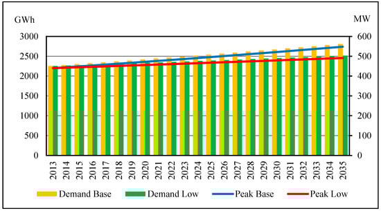 The strategic position in the middle of the Mediterranean Sea and the quite high wave energy potential make Malta one of the best sites for the employment of the innovative Point Absorber here proposed. Moreover, DEIM WEC will be able to increase energetic independence of this country, currently at a very low level. The optimal collocation of the installation sites will be chosen according to different standards, in order to not influence main maritime routes and activities such as fishing []. It is important to say that fishing does not have a main role in the Maltese economy and the off-shore installation of buoys (several kilometers away from the coast) will contribute to the reduction of visual impact from the mainland. Additionally, renewable energy sources will help the local economy, thanks to the creation of a supply chain that does not exist nowadays []. Figure 13 represents Maltese annual energy demand (GWh) and peak demand (MW) projections until 2035. They are both assumed to grow at 1% per year in the base case scenario and 0.5% per year in the low case scenario [].
