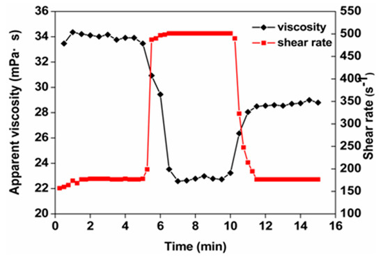 In this study, the shear recovery curve of the copolymer is shown in Figure 2. The viscosity retention ratio of HPMNS solution was 84.9% after it was sheared at the speed of 500 s−1 for 5 min. This indicated that the copolymer had some shear resistance.