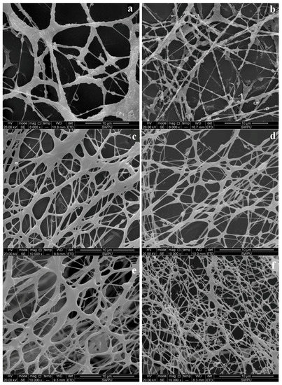 To investigate microstructures of HPAM, HPMNS-1, and HPMNS-2, ESEM was utilized on unsheared and sheared (by the Mixing Speed Governor) polymer solutions. As can be seen from Figure 3a, before shearing, vast molecular coils were entangled with each other, thus forming some network structures in HPAM solution. After shearing, the coil size reduced and the network structures in the solution became weaker (Figure 3b). On the contrary, finer network structures were formed in HPMNS-1 and HPMNS-2 sheared solutions (as shown in Figure 3d,f), which was beneficial for enhancing the acting force among molecular chains and protecting molecular chains from being more damaged. This phenomena is due to the hyperbranched structures of HPMNS in solution; the coil size of the molecule was reduced, but the molecular coils were still entangled after shearing. Therefore, HPMNS had higher viscosity retention ratios than HPAM under the same shear strength.