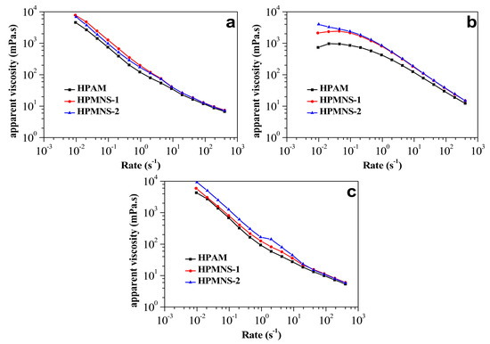 Compared with HPMNS-2, the unsheared HPMNS-1 solution had higher viscosities at low shearing rates. The cause might be that the conformational changes of molecular chains in the polymers were very slow when the shearing rates were low, as they needed to overcome great internal frictional resistance. On the other hand, HPMNS-1 and HPMNS-2 had similar structures before shearing. Under this circumstance, the larger the hydrodynamic radius was, the higher the internal frictional resistance was. Thus, having the higher molecular weight and larger hydrodynamic radius, HPMNS-1 solution had higher viscosity. This phenomenon was opposite in the sheared solution, where HPMNS-2 had higher viscosity than HPMNS-1 at low shearing rates, as shown in Figure 4b,c. This could be attributed to HPMNS-2 having a better shear resistance.
