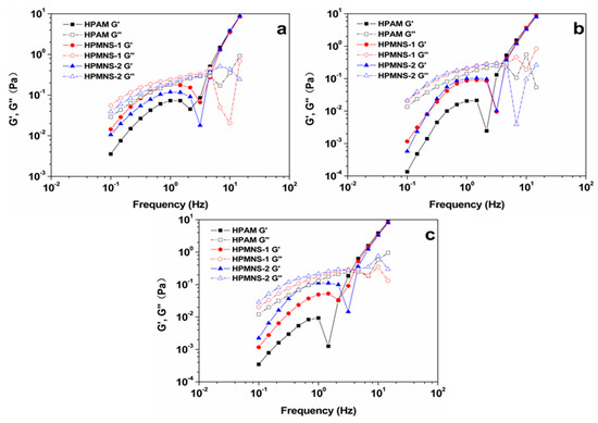The dynamic viscoelasticity of the polymer solutions is shown in Figure 5 (scanning stress: 0.10 Pa, scanning frequency: 0.1–15.0 Hz). At the scanning frequency of 0.1–4.6 Hz, the viscosity modulus (G’’) of the sheared and unsheared polymer solutions were all higher than its elasticity modulus (G’), which was dominated by viscosity. From Figure 5a, the values of G’ and G’’ of unsheared HPMNS-1 solution were both higher than those of HPMNS-2, followed by those of HPAM. With better shearing resistance, HPMNS-2 could be comparable to HPMNS-1 in terms of viscosity modulus and elasticity modulus, after being sheared by the Mixing Speed Governor (Figure 5b). When passing through the pore throat of porous media, HPMNS-2 was more flexible than HPMNS-1, since it could deform and then recover to some extent. By this way, the values of G’ and G’’ for HPMNS-2 increased (Figure 5c).