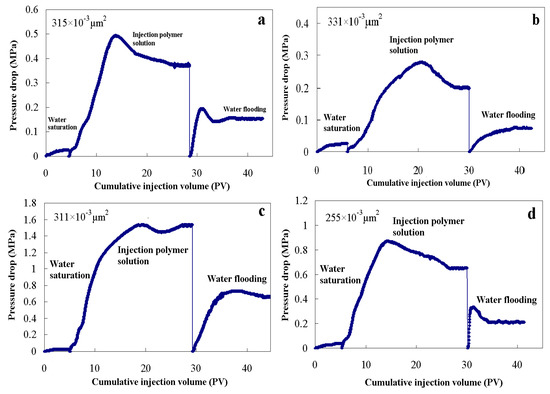With a permeability of K = 300 × 10−3 μm2, the injection pressure curves of HPMNS-2 and HPAM solution in different concentrations (1000, 2000 mg/L) are shown in Figure 6. In an oil reservoir with a permeability of K = 300 × 10−3 μm2, the injection pressures of the copolymer, with concentrations of 1000 mg/L and 2000 mg/L, were less than 0.6 MPa and 1.8 MPa, respectively. The polymer solution was injected after the differential pressure of water flooding became stable and the water-phase permeability was determined. The differential pressure increased rapidly at the beginning and then slowed down. After the differential pressure became stable again, we started water flooding. At this time, the differential pressure fell rapidly and finally became stable. This means that the copolymer solutions had good injectivity in a low-to-medium permeability oil reservoir. As the injection increased, the pressure at the inlet of the homogeneous model rose gently, and reached the peak when the injection volume was about 15 PV. Thereafter, the injection pressure fell to a steady level. It can be seen from the study that the polymer solutions had good mobility control capacities in the porous media with a low-to-medium permeability.