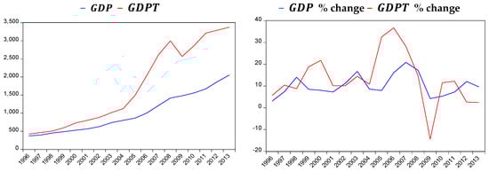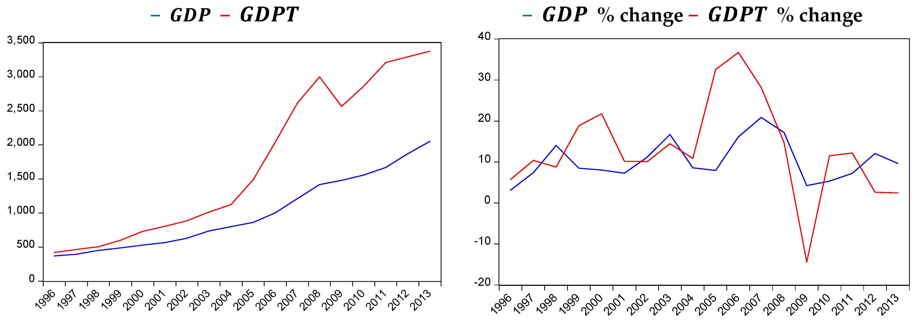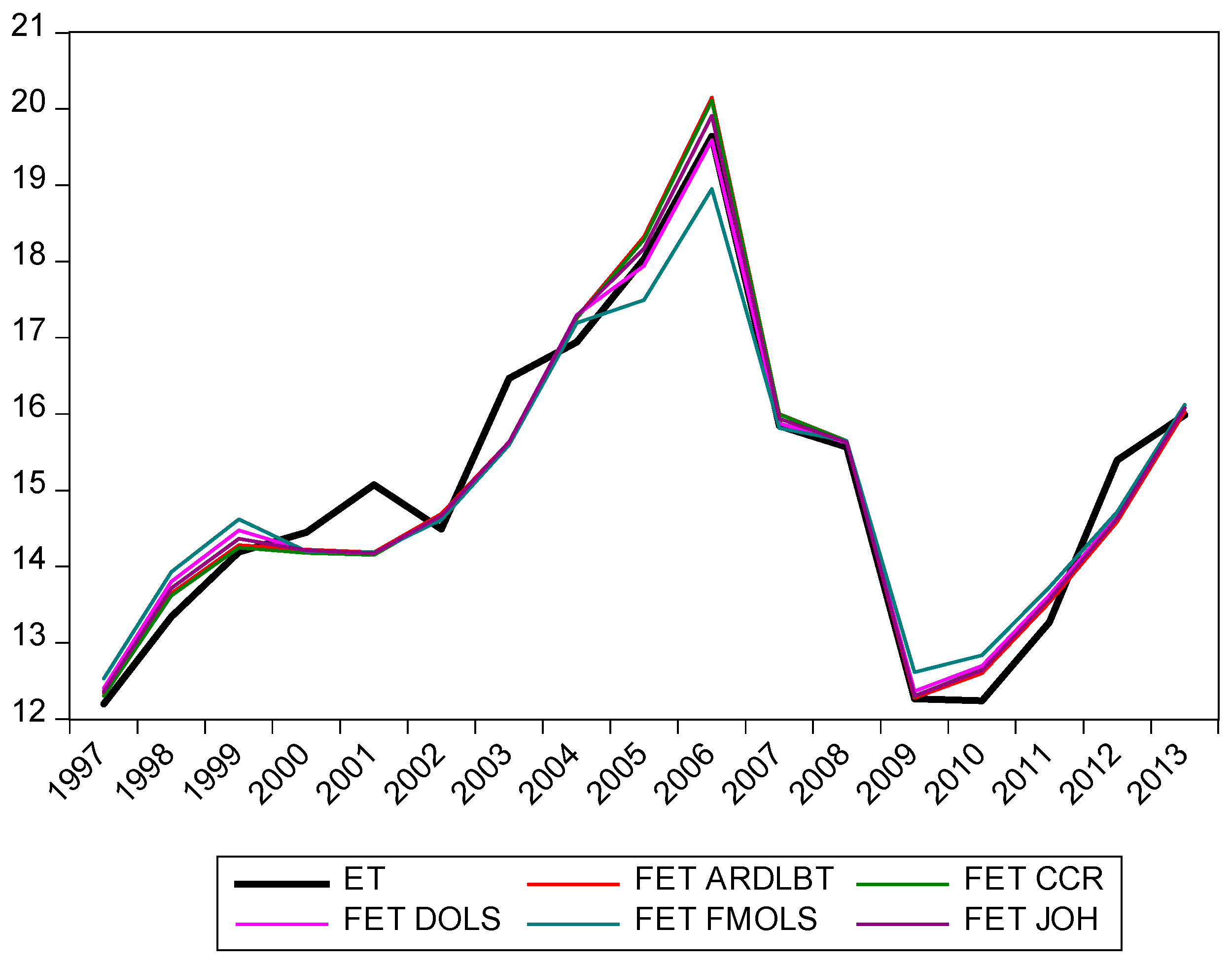 Both the ADF and PP test statistics clearly fail to reject the null hypothesis of unit root for the , , and variables but rejects the null hypothesis for the first differences of them. Both ADF and PP test equations for the first difference of and include neither the trend nor intercept. The insignificance of both deterministic regressors is consistent with Figure 2, which suggests that the growth of both variables are highly likely to have a mean-zero process—in fact, for the period 1996 to 2013 the mean values of and are 0.0009 and 0.007, respectively. As discussed in the methodological section, ADF with structural breaks tests are also run for and . Figure 2 suggests that experienced a sudden break in 2007, whereas experienced a gradual structural break from 2007 up to 2010. Therefore, as a break type, an additive outlier is selected for and an innovative outlier for , but both for 2007. Additionally a lag length of three is specified for given the innovative outlier and a lag order of two for . Finally, a break in both intercept and trend is allowed. This gives calculated ADF statistics of −2.68 and −3.66 for and , respectively compared to the critical values from [53] of −3.87, −4.19, and −4.71 at the 10%, 5%, and 1% significance levels, respectively. Evidently, for and , the null hypothesis of UR cannot be rejected in favor of the alternative hypothesis of trend stationary with break. Thus, the results from the ADF with breakpoint support those from the standard ADF and PP tests. Furthermore, the null hypotheses of a unit root for and are both rejected. Therefore, it can be concluded from the UR tests that , , and are integrated of order one, i.e., they are I(1) variables, whereas and are level stationary, i.e., they are I(0) variables. This implies that and do not contain any long-run information in explaining ; however, this does not rule out the possibility that they may be useful in explaining the short-run dynamics of . It is worth noting that similar results were also found by [36,48,90,91] in their electricity and energy demand modeling.