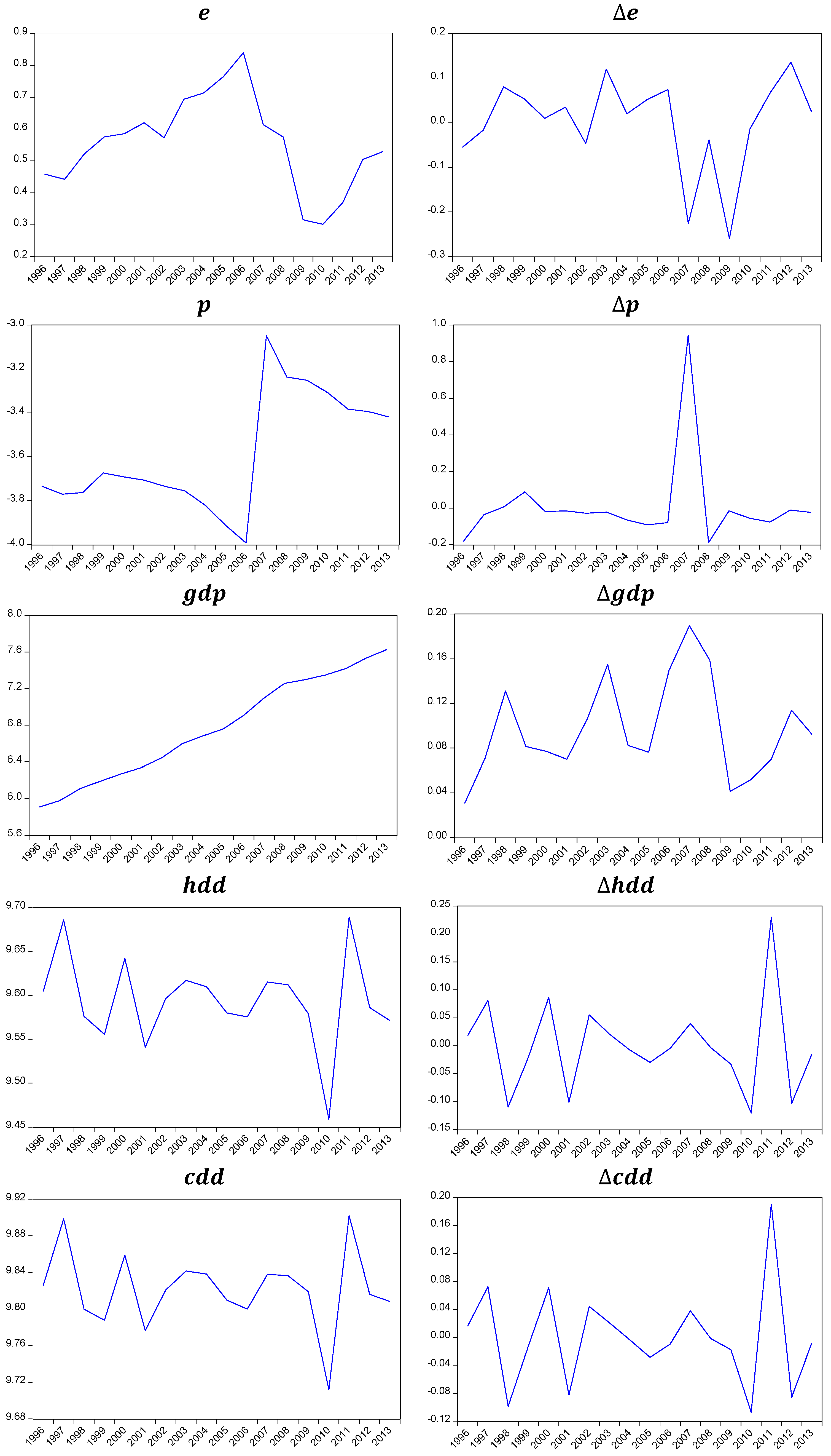 Figure 2 presents the natural logarithm of the variables and their annual changes (represented by ) used in the analysis starting from the same year, 1996, for ease of comparison. These illustrate that electricity consumption per capita grew on average by 3.9% per annum, which represents an increase of about 1.5 times from 1.6 MWh per capita in 1996 to 2.3 MWh per capita in 2006. However, in 2007, electricity consumption in Azerbaijan decreased by 20.2% followed by declines to 1.8 MWh per capita in 2008 and 1.4 MWh in 2009 but recovered again in 2010 and reached the 1990s levels again in 2013.
