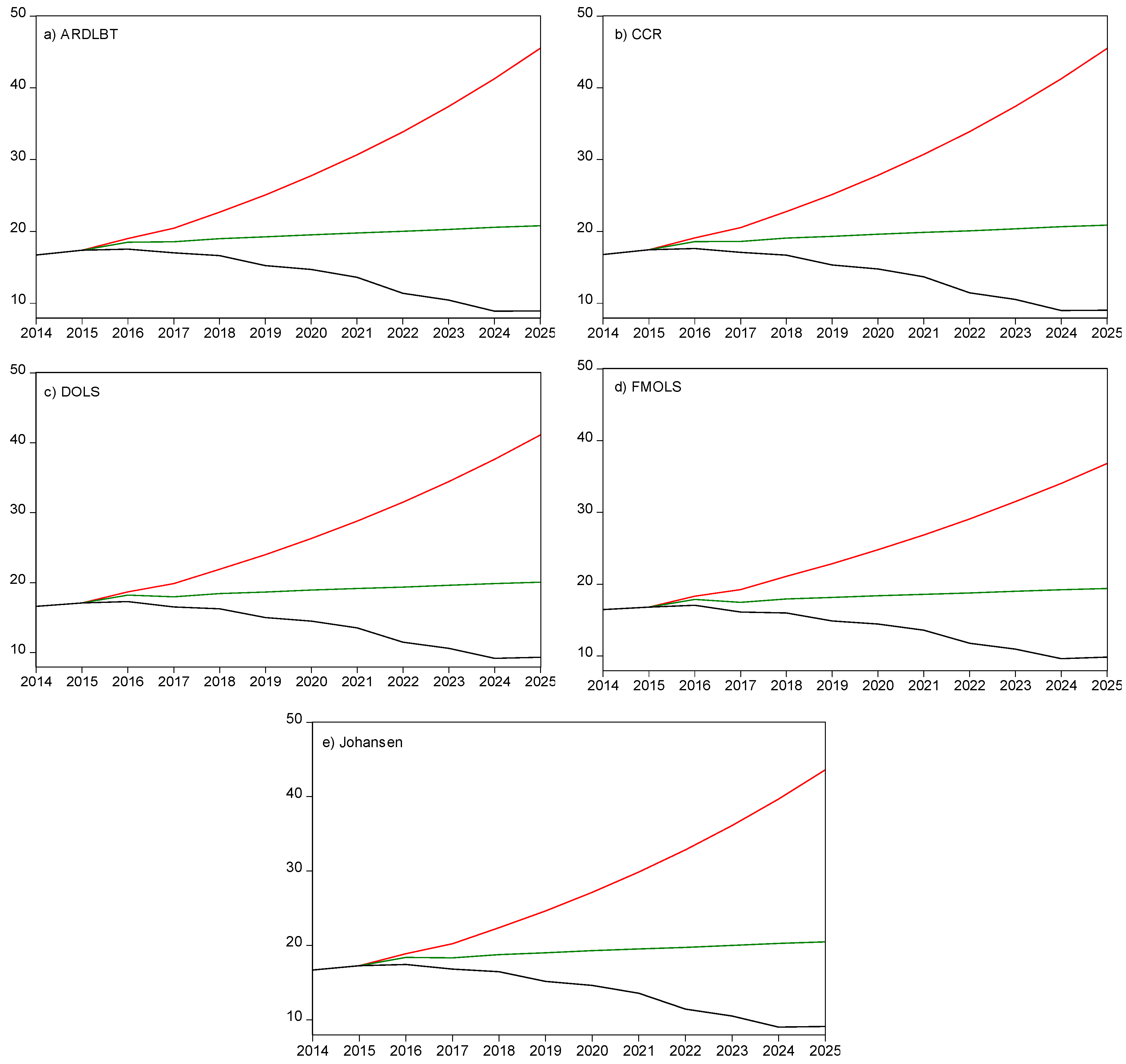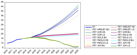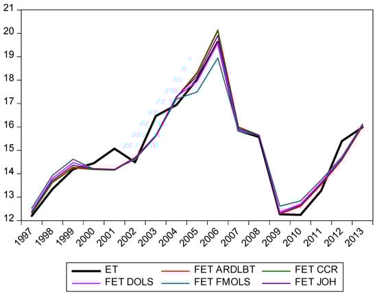 The final alternative approach considered in the empirical work undertaken here is based on the EG method for cointegration [50], which is a residual-based method using a two-step process. The original EG method proposed by [50] estimates the long-run relationship using OLS in the first step of the process, however, if there is cointegration, the estimated coefficients are consistent but the standard errors are incorrect; hence, the original EG method is not used here. Instead, three different ways of estimating the long-run level relationship are employed here for the first step given they correct for the biases, these are DOLS, CCR and FMOLS (see [70,71,72,73,74,75,76,77,78,79,80,81,82] for detailed discussion). For all three methods, the existence of cointegration is tested by checking for the stationarity of the residuals from the level equations using the critical values from [83] instead of [84]. It is recognized that the EG method has some drawbacks and is therefore seen as being inferior to the Johansen and ARDLBT methods. However, given the numerous application of the EG method in previous energy demand studies (for example see the early attempt by [85] and a similar comparison for Sri Lanka [41]) they are used here for a contrast and as a robustness check.