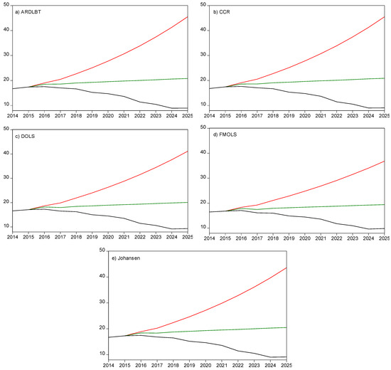 The demand forecast prepared by [12] was reviewed by [15] and considered three scenarios (central, high, and highest) with annual real GDP growth rates of 4%, 6%, and 7%, respectively—similar to [12]. Using the same income elasticities as [12,15] produced lower forecast values for 2017 of 27,000 GWh compared to 30,000 GWh by [12]. Unfortunately, [15] does not mention the methodology used to generate their forecasts. In addition, [14], based principally on the electricity demand forecasts provided by [11], applied the previous year’s GDP growth rate of 5.1% for 2020 and onwards and found projected electricity demand in 2025 to be 42,000 GWh—being quite close to [15]’s projections. Again, [14] unfortunately does not explicitly report the methodology used to produce the forecasts.