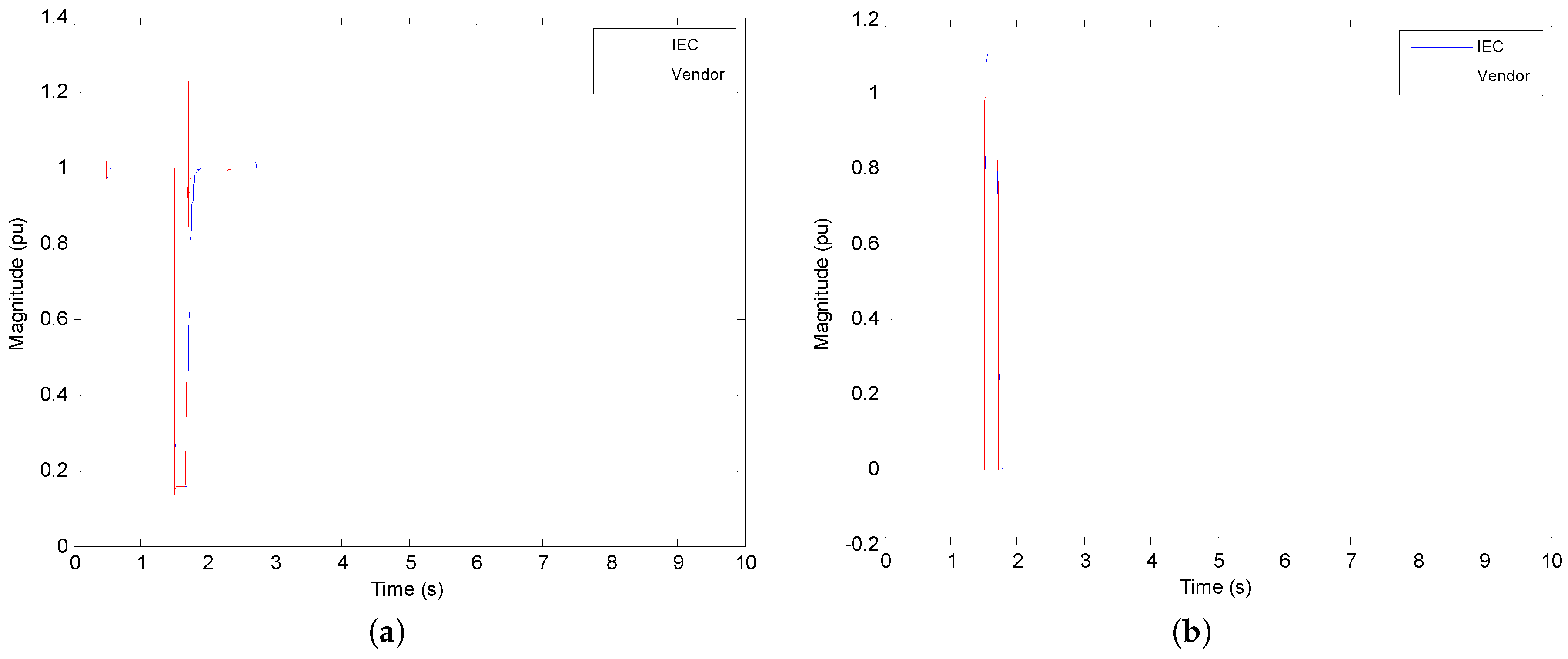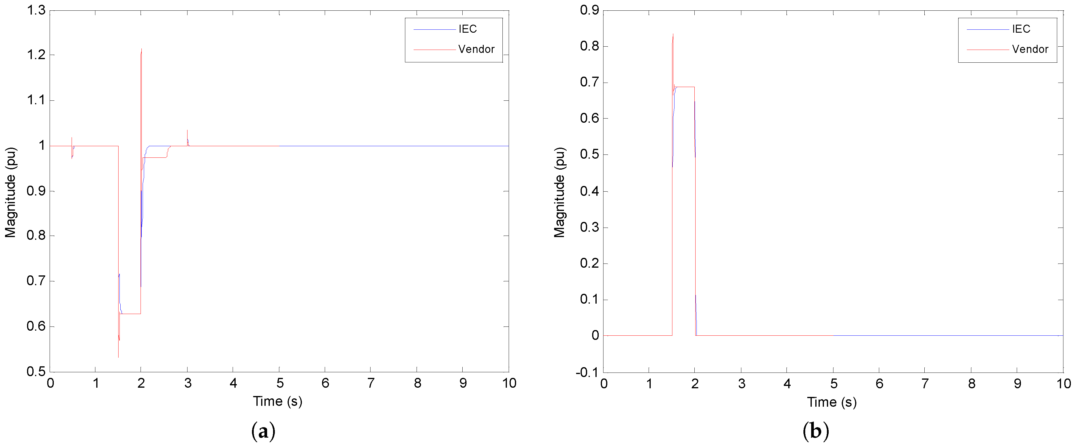 - Reactive curve injection: The reactive current injection curve cannot be perfectly matched using the IEC generic model. The main problem is the modeling of reactive current injected during voltage dips in the grid-side converter of the DFIG design. Using the best approximation, the reactive current is excessively limited between 0.75 pu and 0.90 pu rated voltage. This affects the reactive current error coefficients calculated during the fault window. However, these differences may be acceptable (below 5%).