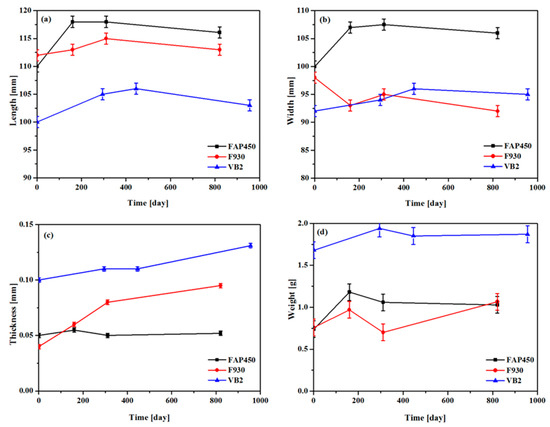 (a) Length; (b) width; (c) thickness; and (d) weight of (■) FAP450, (●) F930 and (▲) VB2 membranes as function of immersing time in 1.6 mol·L−1 VO2+/4.2 mol·L−1 total sulphate solutions.