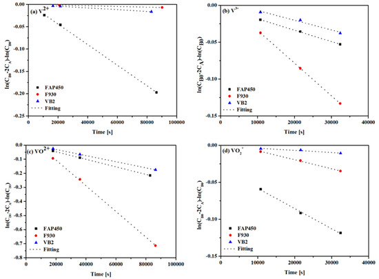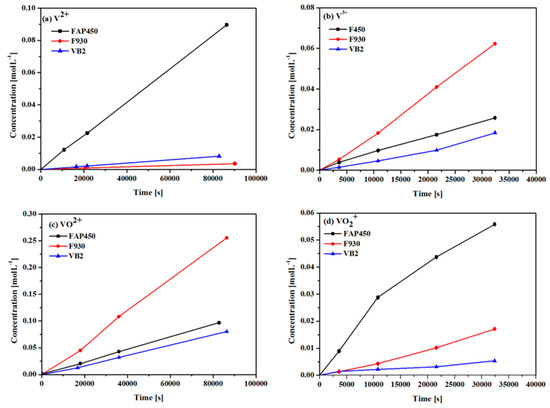 For all systems, the concentrations of transported vanadium ions increase as the diffusion time increases. When the ion permeation commences, vanadium ions migrate across the membrane. The ionic strength balancing ions in the enriching solution simultaneously move in the opposite direction such as (e.g., Mg2+ in V2+ or VO2+ systems, Fe3+ in V3+ system and K+ in VO2+ system). Unlike other reported measurements which only employed H+ and/or Mg2+ ions as the cations in the blank solutions [3,4,5,6,12,13,14,15,19,21,23,29,30], here no extra H+ ions is needed in the opposite flux to compensate the charge to reach electro-neutrality, which can significantly reduce the coupled water transfer with H+ ions (in the hydrous form of H3O+) and weaken the Donnan potential effect. In fact, no volume change was observed except the volume of taken samples.