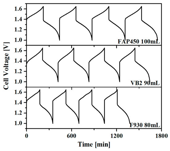 Charge-discharge profiles under constant current charge at 40 mA·cm−2 for FAP450, VB2 and F930 membranes.