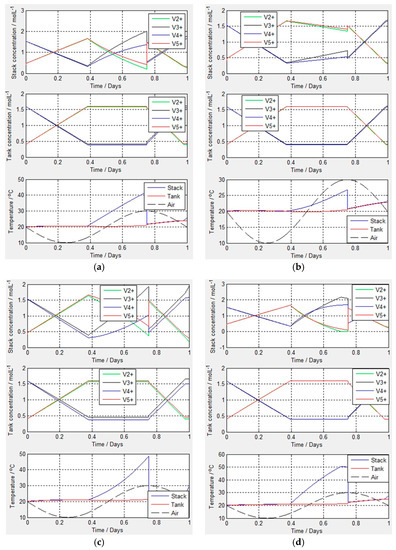 The concentration and temperature variation of stack and tank of FAP450, VB2, F930 and Nafion 115 in the first day of operation are presented in Figure 5a–d. Taking FAP450 membrane (Figure 5a) as example, the concentration of V2+ and VO2+ ions increase during charging while the V3+ and VO2+ ions decrease as expected. When the battery enters the standby mode and the pumps are switched off, the high SOC electrolyte inside the stack undergoes self-discharge reactions (1) and (4) so that the concentrations of V2+ and VO2+ within the stack drops while V3+ and VO2+ ions increase. Due to the disparity of permeability rates of V2+ and VO2+ ions across the FAP450 membrane, charged V2+ ions deplete faster than the VO2+ ions. Since no self-discharge reactions occur in the tanks, the tank concentrations during the standby period remain constant until discharging starts. During the idle period, the self-discharge reactions in the stack are the only heat source, which can increase the temperature in the stack above 40 °C. The consequence of such a temperature increase cannot be understated as VO2+ tends to precipitate at temperature above 40 °C if the concentration is high, thereby increasing the risk of blockage in the cell stacks. However, in this case, the temperature increase is accompanied by a decrease in VO2+ ion concentration in the stack, so no precipitation would be expected in the present situation. Furthermore, a drop in stack temperature can be achieved by turning on the pumps to allow the electrolyte to be circulated so as to dissipate the heat to the environment or into the tanks, as observed in the temperature profile in Figure 5a. Among all the membranes simulated here, Nafion 115 and F930 exhibit the largest heat generation and can even reach 50 °C while VB2 shows the best performance with the temperature only rising to around 28 °C. The peak temperature for the four membranes during the first cycle is in the order VB2 < FAP450 < F930 < Nafion 115.