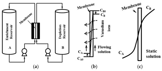The setup for the measurement of the permeability rate was designed as a cell with circulating vanadium electrolyte and blank solution of the same volume on each side of the membrane, as shown in Figure 7a. 70 mL vanadium solution and corresponding blank solution were filled in depletion and enrichment side respectively as described in Section 2.2 to equalize the ionic strength of the solutions and minimize osmotic pressure effects and solvent transfer. The chemicals used to prepare the blank solutions including K2SO4, MgSO4 and Fe2(SO4)3 were purchased from Sigma-Aldrich, Sydney, Australia. Inert gas protection was provided during the permeability measurements for V2+ ions. The reservoirs were shielded from the light when using Fe3+ in the test cell to avoid photodecomposition of Fe2(SO4)3. The solutions on both sides were pumped through the diffusion cell in order to avoid concentration polarization at the membrane surface, as shown in Figure 7b,c, respectively. At regular intervals, 1 mL samples were withdrawn from the blank solution and measured by ICP-AES to determine the concentration of the vanadium ions within an accuracy of 99%. The temperature of the solution in the enrichment reservoir was monitored during the entire diffusion test. For each diffusion test, a new and dry membrane was used as received.
