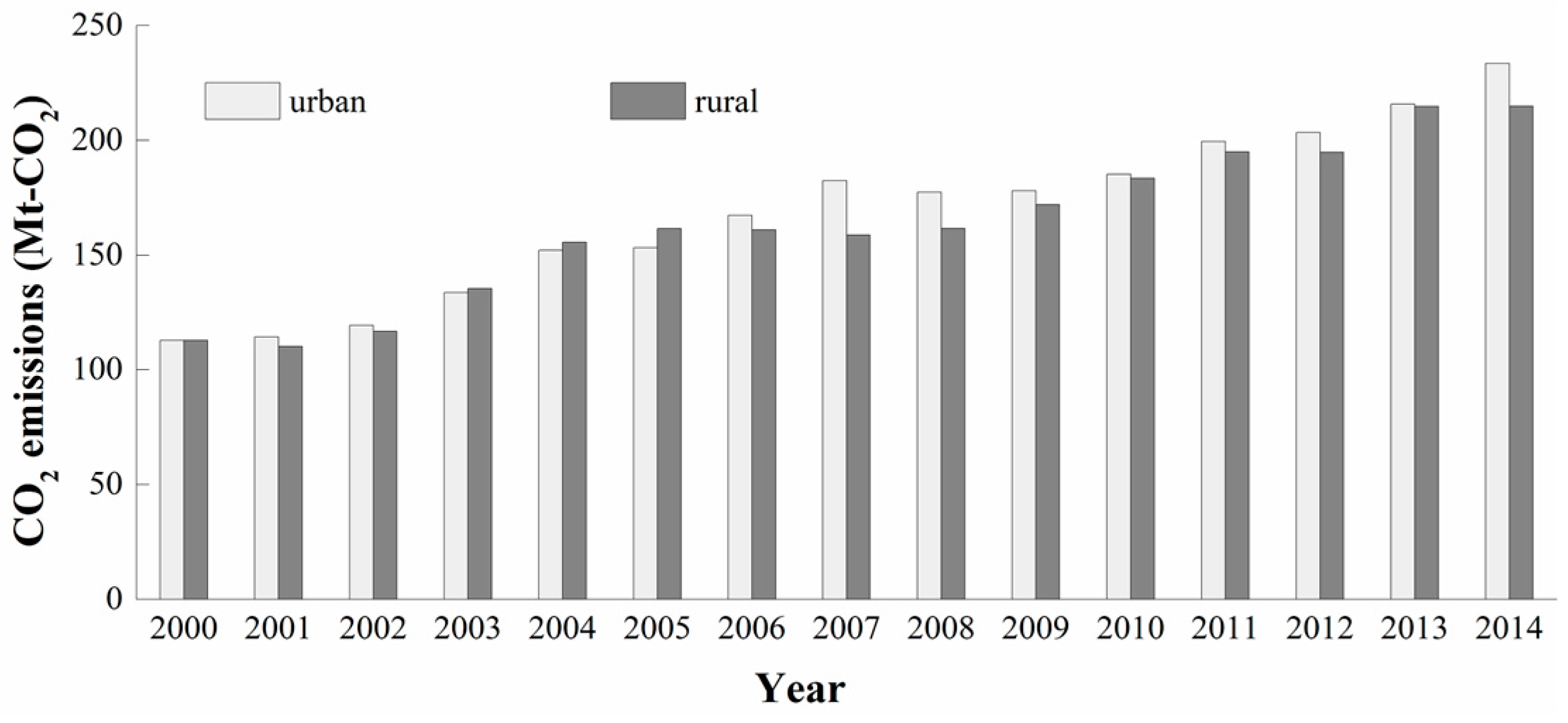 - Qu, J.S.; Maraseni, T.; Liu, L.N.; Zhang, Z.Q.; Yusaf, T. A comparison of household carbon emission patterns of urban and rural China over the 17 year period (1995–2011). Energies 2015, 8, 10537–10557. [Google Scholar] [CrossRef]