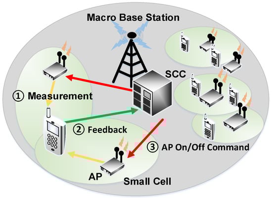 We assume that small cells can be deployed by users or an MNO; thus, the deployment can be unplanned, and small cells are randomly deployed, resulting in a dense and possibly redundant deployment. It is plausible that if the APs are placed in a home, they can use the Internet as the backhaul to communicate with the macro base station. We assume that APs are deployed in the coverage of a macro BS. For example, in NTTDOCOMO’s phantom cell concept [19], the control plane and user plane are separated in different frequency bands in which high capacity and good mobility can be supported. We assume that the control plane and the user plane are provided by the macro BS and small APs, respectively. We introduce an entity located in the macro BS called the small cell controller (SCC). From [2], the AP on/off operation can be classified into two cases: the core network (CN) controlling and UE controlling. By taking advantage of CN and UE controlling, we propose a device-assisted framework shown in Figure 1. In the device-assisted framework, UEs measure beacon signals that APs broadcast and send feedback to the SCC. Then, the SCC determines the set of turned-on APs by exploiting the feedback.