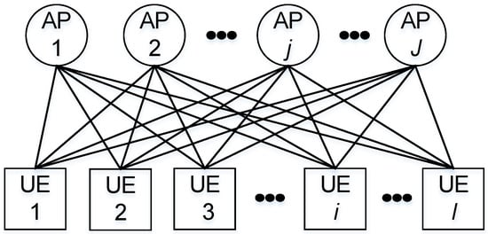 where is the channel gain between UE i and AP j, and is the noise power. Then, the maximum spectral efficiency of UE i served by AP j is . We assume that when an AP j has multiple associated UEs, the associated UEs are scheduled in a temporally fair way or equally when sharing the frequency channel; thus, the data rate of UE i is given by: