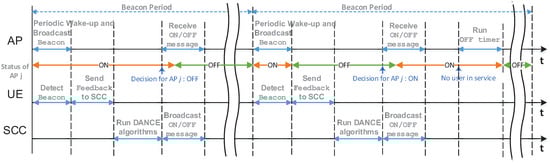 The message passing procedures for both the turning off and on operation in DANCE are illustrated in Figure 3. As mentioned in Section 2, each AP periodically wakes up and broadcasts a beacon signal, and each UE senses the APs’ beacon signals. Information gathered at each UE is sent to SCC. Then, SCC runs one of the DANCE algorithms in order to make a decision for each AP’s on/off status by using the feedback information from UEs. Then, SCC broadcasts the final decision to all APs, and APs follow the direction of SCC.